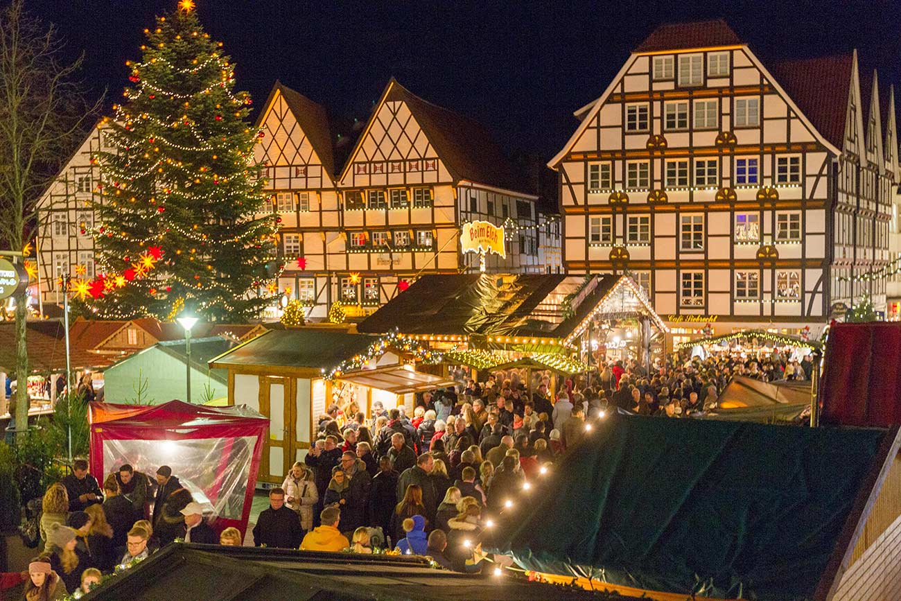 • Mittelalterliches Flair: Ein Weihnachtsmarkt vor der Kulisse der historischen Soester Fachwerkhäuser.